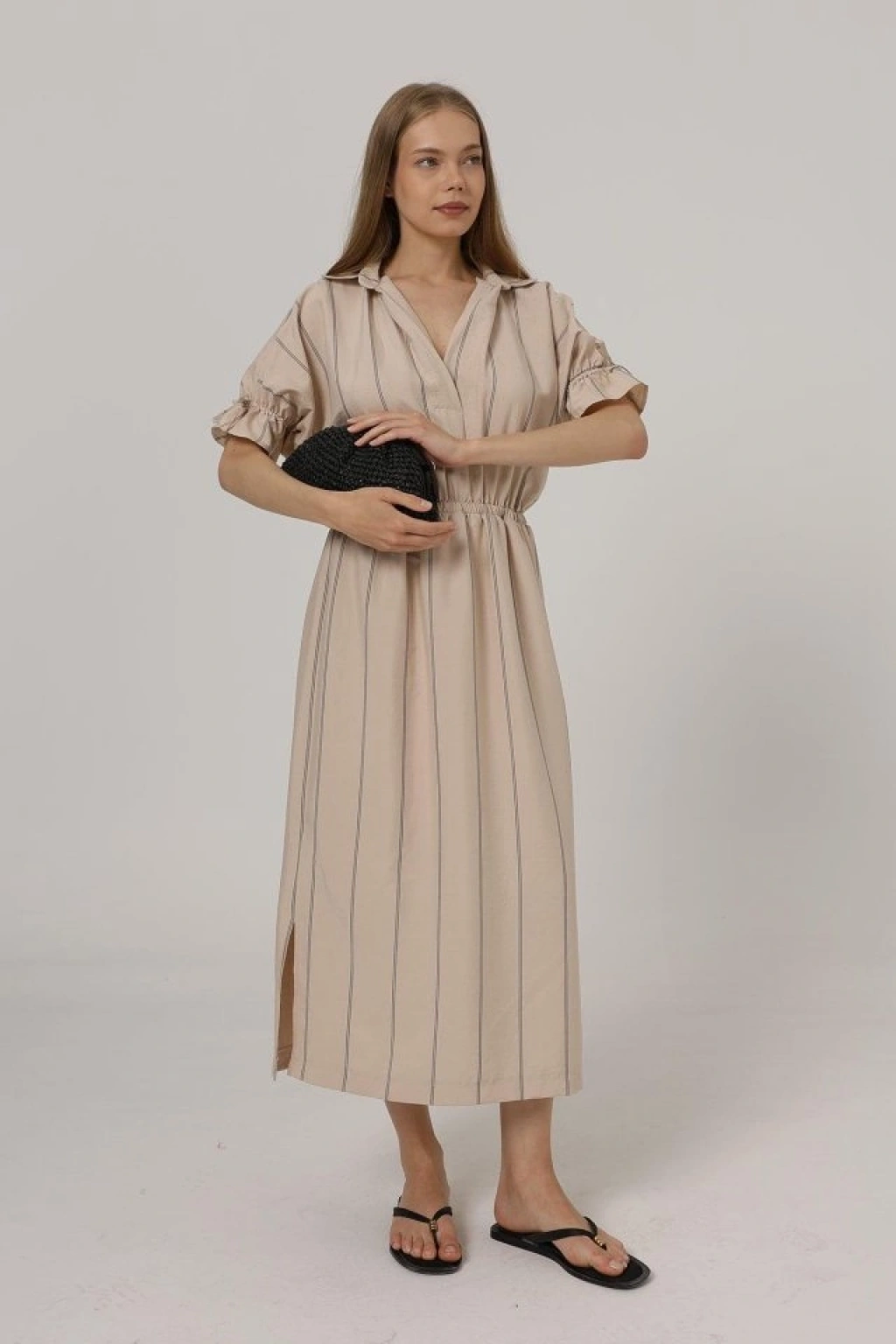 Beli Lastikli Elbise - Taş