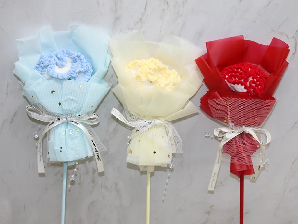 EL ÖRGÜSÜ TEKLİ ÇİÇEK BUKETİÜrün ÖzellikleriEl Örgüsü Tekli Çiçek Buketi, zarif tasarımı ve el emeği dokusuyla dekoratif amaçlı kullanılabilen şık bir aksesuardır. 37 cm boyutundaki kompakt yapısı sayesinde masa üstü düzenlemelerinde, hediye sunumlarında, özel gün kutlamalarında ve fotoğraf çekimi konseptlerinde estetik bir tamamlayıcı olarak tercih edilir. Örgü çiçeğin yumuşak dokusu ve tül kaplamalı dış formu ürüne romantik ve sevimli bir görünüm kazandırırken, sap kısmındaki kurdele detayı hediye sunumu için ideal bir şıklık sağlar. El işçiliğiyle üretildiği için her bir buket kendine özgü bir karakter taşır. Renk seçimi yapılamaz; görseldeki renklerden biri karışık olarak gönderilir. Hem el yapımı ürün sevenler hem de dekoratif çiçek arayanlar için ideal bir tercihtir.Paket İçeriği1 adet El Örgüsü Tekli Çiçek Buketi