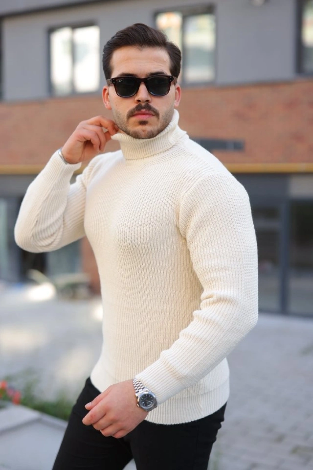 Erkek Yarım Boğaz Triko Kazak Yumuşak Dokulu Pamuklu Ince Dokuma, Uzun Kollu Rahat Regular Kalıp - Beyaz