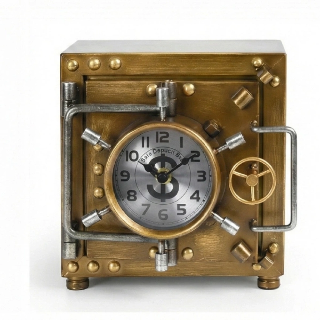 KASA TASARIMLI MASAÜSTÜ SAATÜrün ÖzellikleriKasa tasarımlı masaüstü saat, klasik kasa kapaklarından ilham alan detaylı ve özgün görünümüyle dekoratif saat kategorisinde öne çıkan özel bir modeldir. Metal görünümlü gövdesi, vidalı ve kilitli kasa detayları sayesinde endüstriyel ve retro dekorasyon tarzını başarıyla yansıtır. Saatin ön yüzünde yer alan yuvarlak kadran, net rakam yapısı ile kolay okunabilirlik sunarken mekanik kasa hissi veren tasarımı bulunduğu ortamda dikkat çekici bir dekor unsuru oluşturur. 17x20x21 cm ölçüleri sayesinde masa, raf, kitaplık, ofis masası veya vitrin üzerinde dengeli ve güçlü bir duruş sergiler. Sessiz akan mekanizması sayesinde çalışma, dinlenme ve ofis ortamlarında rahatsızlık oluşturmaz. Dayanıklı yapısı uzun süreli kullanım için uygundur. Renk seçeneği bulunmamaktadır; ürün gümüş veya altın tonlu kasa seçeneklerinden karışık olarak gönderilmektedir. Hem fonksiyonel hem de dekoratif bir masa saati arayanlar için şık ve farklı bir alternatiftir.Paket İçeriği1 adet kasa tasarımlı masaüstü saat