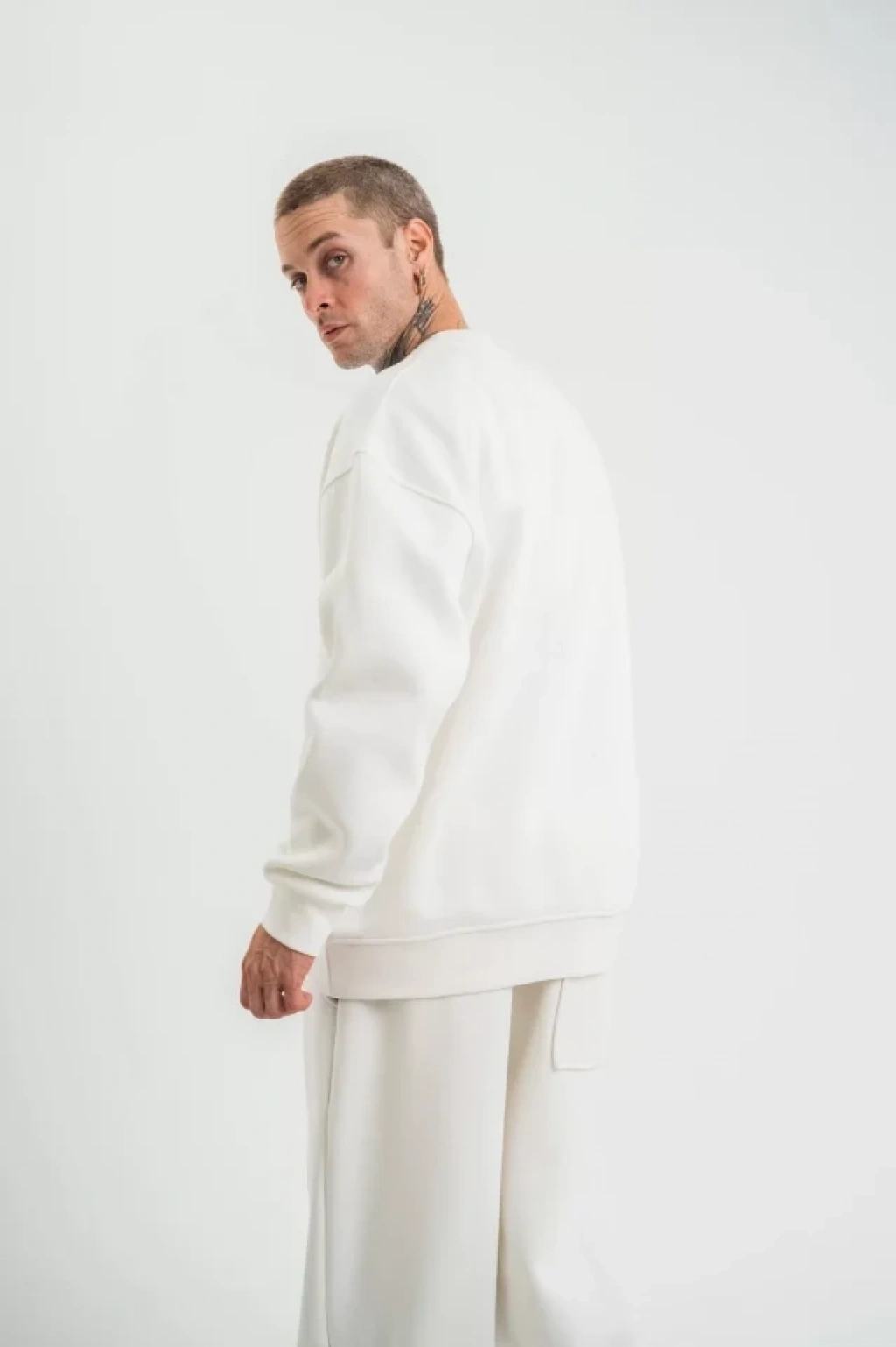 Erkek Sırt Baskılı Oversize Üç İplik Kapüşonlu Sweatshirt - Beyaz